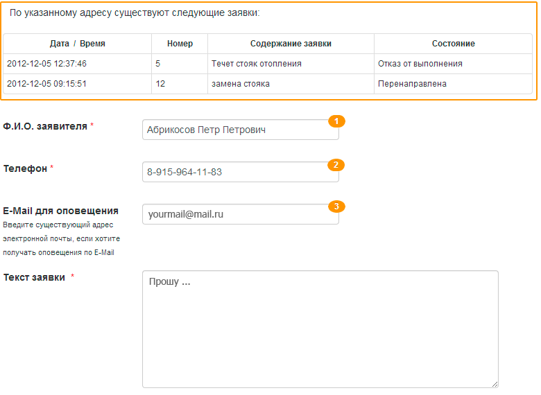 Вам отобразится таблица с информацией об уже существующих заявках по этому адресу (выделена желтым прямоугольником). Если Вы хотите подать новую заявку, то заполните обязательные поля Ф.И.О. 1, Телефон 2 и Текст заявки. Если Вы хотите получать информацию по заявке, то введите в поле "E-mail для оповещения" 3 свой адрес электронной почты.