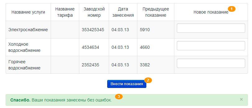 Если Вы убедились в правильности введенных данных, то нажмите кнопку «Внести показания» 2.