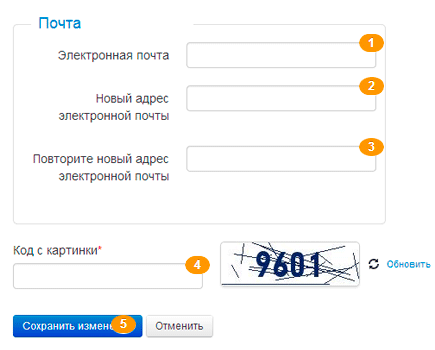 Используя форму изменения адреса электронной почты и пароля, которая расположена на странице Профиля пользователя, Вы должны указать свой новый адрес электронной почты 2 на смену текущему адресу 1. Продублируйте новый адрес в поле номер 3. Затем введите код с картинки 4и нажмите кнопку "Сохранить изменения" 5. Вам выдастся сообщение об успехе или ошибке (если не все поля заполнены верно).