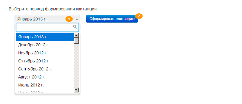 Используя форму формирования квитанции, которая расположена на странице "Печать квитанций", Вы должны выбрать из выпадающего списка 1 нужную Вам дату и нажать кнопку «Сформировать квитанцию» 2. Дождитесь окончания операции и Вам будет сформирована квитанция для печати.