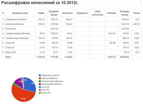 Дождитесь окончания операции, и Вам будет выдана информация в виде таблицы. Нажав на строчку таблицы, Вам отобразится всплывающее окно с подробной информацией по начислениям за месяц и диаграммой процентного соотношения видов услуг от общей суммы начислений.
