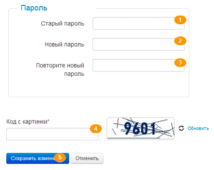 Используя форму изменения адреса электронной почты и пароля, которая расположена на странице Профиля пользователя, Вы должны ввести свой текущий пароль в поле 1, затем новый пароль в поле 2 и продублировать новый пароль в поле номер 3. Затем введите код с картинки 4и нажмите кнопку "Сохранить изменения" 5. Вам выдастся сообщение об успехе или ошибке (если не все поля заполнены верно).