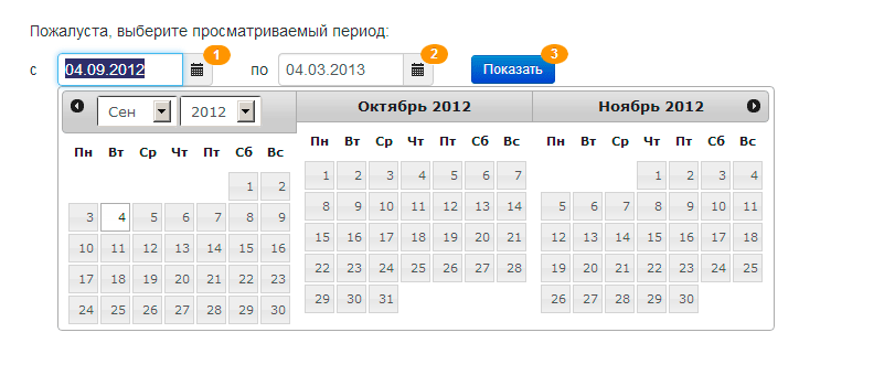 Используя форму формирования истории платежей, которая расположена на странице истории платежей, Вы должны выбрать период, за который вы хотите просмотреть историю платежей. Для этого нажмите на картинку календаря 1, в появившемся календаре выберите начальную дату периода. Аналогично выберите дату окончания периода, нажав на 2. Затем нажмите на кнопку «Показать» 3.
